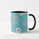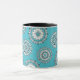 Uma caneca de 325 ml com o meu Padrão Mandala 1 impresso em fundo azul.