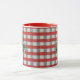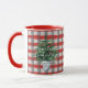 Os montes saudam a aquarela, a caneca de Natal. Texto manuscrito. Uma tomada moderna da tradição vermelha e verde.