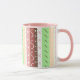 Caneca branca de café personalizada, com bolinhas verdes cor-de-rosa, mauve, castanho, burgundy e sábio e padrões de listras. As cores quentes da Terra. Rochas e bolinhas.