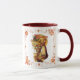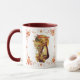 Uma caneca de café com uma imagem de Ação de Graças vintage de uma garota peregrina com cornucópia e fronteira de outono.