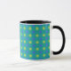 Uma caneca branca e preta de Ringer com um padrão Bolinhas de Luas Azuis em Neon Green e Azul Azuis em um fundo Verde Esmeralda. Parte da coleção 'Luas Azuis' de Posh & Painterly.