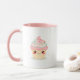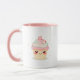 Bolo de aniversário fofo com rosto sorridente, cobertura rosa e menta, flores, confeitos, coração no topo, estrelas e brilho.