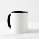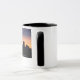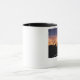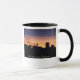 Um nascer do sol da manhã sobre a cidade de Baltimore em uma caneca branca com guarnição preta no punho e na borda.