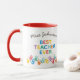 Melhor Professora Bela de Todos os tempos com mãos pintadas multicolorido com pequenos rostos e corações. Em cores brilhantes e felizes sobre fundo branco.