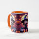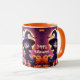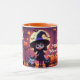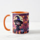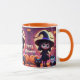 Esta caneca apresenta uma bruxa bonita em uma fantasia negra com gatos e abóboras na noite de Halloween. Decoração divertida e presente para o Dia das Bruxas! Custom Text.