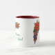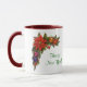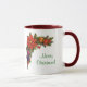 Esta caneca bonito do feriado caracteriza uma grinalda do Natal em cada lado, termina-a com poinsétia e os bulbos brilhantes. O texto em um lateral diz o "Feliz Natal! ", e no outro, "o feliz ano novo!" Todo o texto é customizável.