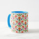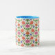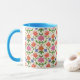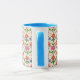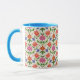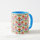Uma caneca branca, cerâmica branca, com lábio azul e alça e um padrão colorido de flores e Bolinhas cor-de-rosa e laranja num fundo Ecru texturizado em folha. Parte da coleção Posh & Painterly 'Rangoli', este padrão de na moda pode ser ajustado para ajustado qualquer Mug de Café.