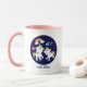 Caneca personalizada com 2 unicórnios dançantes bonitos com caudas brilhantes e coloridas, e mano. Um arco-íris colorido com nuvens em cada lado acima de suas cabeças. Outros elementos incluem uma pequena flor, um coração e algumas estrelas. Círculo roxo escuro atrás da imagem para ajudá-la a pop!