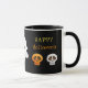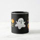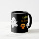 Aqui está uma caneca fofa para a temporada de Halloween de outono! Ele apresenta o texto "Boo Y'all" em amarelo-claro, com um Jack laranja resmungando ou Lanterna ao lado. O outro lado tem texto personalizado em amarelo e laranja que atualmente diz "Feliz Dia das Bruxas". Abaixo do texto encontram-se dois crânios de ressonância, um de branco e outro de laranja. No centro está um fantasma adorável.