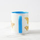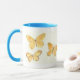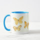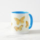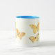 Uma caneca branca com jante azul e alça e um delicado desenho pintado de borboletas laranja.