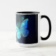 Fabulosa, brilhante, azul e amarela, borboleta noturna sobre fundo escuro.