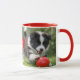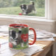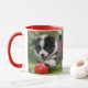 This mug is perfect for any dog lover! It features a charming black and white Border Collie puppy playing with a red ball in the grass. A red heart and the words "dog lover" complete the design. Customize this mug with your own text, monogram, or other personal touches. AI dog image designed by Susang6.