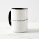 Uma grande caneca branca com alça preta e um texto impresso preto sobre ela.
