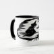 Caneca bruxas negras assustadoras e voadoras sobre vassou