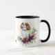 Um retrato de aquarela de um adorável cão Cavalier King Charles Spaniel emerge de um buquê vermelho e rosa-escuro nesta caneca. Por trás da imagem do cão está um spray de confete de ouro. A imagem aparece em dois lados da caneca, com seu nome em preto entre eles. Se preferir, você pode remover o texto limpando o campo modelo.