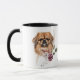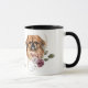 Um retrato de um lindo cão Pekingese castanho avermelhado está atrás de um bonito buquê floral de inverno nesta caneca. Por trás da imagem está uma espiral de brilho de ouro falso. A imagem é impressa duas vezes na caneca, com seu nome personalizado ou outro texto entre eles.