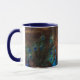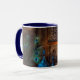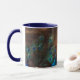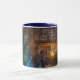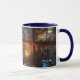 Uma cena confortável e rústica de cabana com uma mesa com penas de pavão em um vaso de cobre, cerâmica azul, livros e uma lâmpada de querosene. A luz da lua é vista através da geada de inverno em painéis de janela.