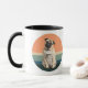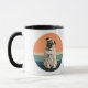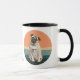 Um retrato de um Cachorro Pug adorável é a característica nesta caneca. A imagem é colocada sobre um fundo solar azul e coral retrorreflectores, levemente angustiados, e impressa duas vezes na caneca. Seu nome está em um script preto entre as imagens.