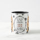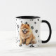 Um lindo Cachorro ChowChow vermelho laranja fica em dois lados desta caneca. O texto entre as duas imagens diz: "No oitavo dia, Deus criou o CHOWCHOW e o chamou de MUITO BOM". As imagens do cão e o banner branco oval que contém os campos de texto são colocados sobre um fundo branco com impressões de pata preta.