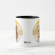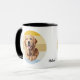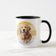 Um retrato de um belo Ouro Cachorro do Retriever é a característica nesta caneca. A imagem é colocada sobre um fundo solar retrorreflector, ligeiramente angustiado, bronzeado e faixa azul, e impressa duas vezes na caneca. Seu nome está em um script preto entre as imagens.