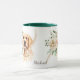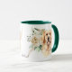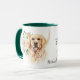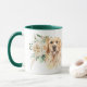 Por trás deste belo retrato aquoso de um Ouro majestoso Cão do Retriever nesta caneca está um bonito buquê branco de rosa. A imagem do buquê e do cão está contra uma espiral sobreposta de faux glitter confetti. A imagem é impressa em dois lados, com seu texto personalizado em marrom no centro inferior entre as imagens. Perfeito para quem perdeu o coração para um Ouro!