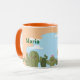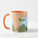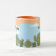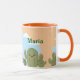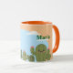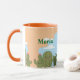 Isto é um cactos bonito e uma caneca azul. A caneca tem cactos verdes com flores cor-de-rosa e bochechas cor-de-rosa, um céu azul com nuvens brancas e um fundo laranja claro. A caneca é uma caneca combo com um interior cor de laranja e uma alça laranja. Esta é uma caneca fofa que daria um bom presente. O nome Maria está em ambos os lados da caneca em texto verde. Você pode adicionar um nome com o botão Personalizar.