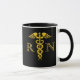 Imagem do símbolo médico caduceus e letras estilizadas R e N - Enfermeiro registrado. Caneca de café de arte elegante. Você pode transferir este design para outro produto, basta usar a opção a seguir. Divirta-se, comprar, aproveite, fique seguro e seja feliz!