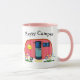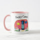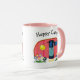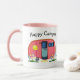 Combo uma caneca de café com dois tons (rosa e branco mostrados aqui) com reboque de campo pintado, flores e uma cara de sol feliz.