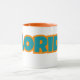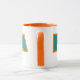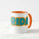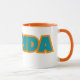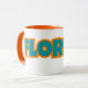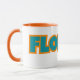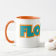 Esta caneca de café personalizada apresenta um design que exibe a palavra "Flórida" em uma impressão de Cara Luckiest com letras coloridas aqua contorno cor de laranja neste tema de estilo de camisa do orgulho de estado personalizado. A jante e o manípulo são vidrados em cores compatíveis, disponíveis em micro-ondas e máquinas de lavar louça de tamanho 11 onças ou 15 onças, construindo cerâmica segura.