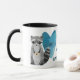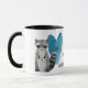 Um guaxinim adorável segura uma xícara de café com um coração azul atrás dele. A imagem está em dois lados da caneca, com o texto entre as imagens que diz "COFFEE é o meu ANIMAL ESPIRITUOSO". Bonita!
