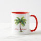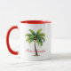 A caneca de café é mostrada em branco com dentro vermelho, com impressão de palmeiras de Natal. O texto diz Feliz Navidad. Personalize esta caneca ou comprar como está.