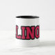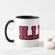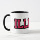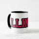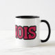 Esta caneca de café personalizada apresenta um design que exibe a palavra "Illinois" em uma fonte impressão do Kompot Slab com letras vermelhas em contorno preto neste tema do estilo jersey do orgulho do estado personalizado. A jante e o manípulo são vidrados em cores compatíveis, disponíveis em micro-ondas e máquinas de lavar louça de tamanho 11 onças ou 15 onças, construindo cerâmica segura.