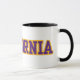 Esta caneca de café personalizada apresenta um design que mostra a palavra "Califórnia" em uma fonte impressão Sólido do Anuário com letras roxas com contorno colorido amarelo neste tema de estilo de camisa do orgulho de estado personalizado. A jante e o manípulo são vidrados em cores compatíveis, disponíveis em micro-ondas e máquinas de lavar louça de tamanho 11 onças ou 15 onças, construindo cerâmica segura.