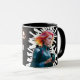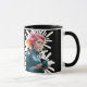 Café porque adulterar é caneca duro A imagem mostra uma mulher futurista e rebelde de cabelo neonautista, vestindo uma jaqueta metálica, segurando uma xícara de café brilhante. O fundo é uma abstrato esbranquiçada escura de linhas brancas, acrescentando uma sensação de movimento ou impacto. À esquerda, o texto neon em negrito diz: "Café: porque adultar é duro", em um estilo de letra manuscrito e divertido, brilhando suavemente contra o fundo preto.