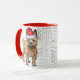 A caneca tem uma design de um cachorro doce do Cairn Terrier vestindo um chapéu de Papai Noel. O fundo da caneca é coberto por um padrão repetitivo das palavras "woof". A imagem é brilhante e alegre, e seria perfeita para um presente temático de Natal.