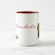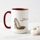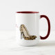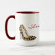 Uma caneca de café divertida com gráficos de um padrão de pele de onça-pintada, com saltos altos. Texto vermelho, no meio lê Shoeaholic. Personalize o texto para ler o que quiser. Excelente senhoras para casa ou escritório.