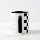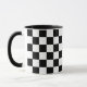 A caneca na moda apresenta um calendário preto 2026 de um lado e do outro, um padrão de verificação em negrito preto e branco feito de linhas de quadrados brancos e negros alternados como em uma bandeira de corrida. A caneca tem uma alça preta e interior que você pode personalizar na barra lateral. Copyright ©Claire E. Skinner. Todos os direitos reservados.