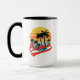 Caneca da Califórnia com um design que apresenta um pôr do sol retrô e palmeiras. Este design também tem a Califórnia em uma fonte manuscrita com um glifo de cauda de inchaço para aquele olhar na moda Retro. Esta caneca é só para você se você é da Califórnia ou se você é como um presente ou lembrança para dar a alguém.