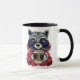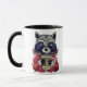 Um guaxinim bonito vestindo um capuz vermelho segura uma xícara de chocolate quente