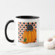 Camisetas coloridas do Halloween, canecas, cartões, adesivos, bolsas de truque ou de tratamento, ímanes e outras roupas e presentes do Halloween com um gato preto giro na abóbora e design de pontos cor laranja e preto!