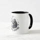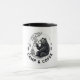 A black-and-white illustrated design of a bear enjoying a steaming cup of coffee beside a campfire, surrounded by trees and stars.