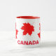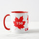 Três folhas vermelhas de maple voando no vento do outono. Número 150, folhas dentro à esquerda e à direita. Palavra vermelha no Canadá sob a folha média. Na moda elegante caneca de café vermelha e branca para qualquer um celebrar o 150º aniversário do Canadá. Personalizável. Você pode alterar o estilo da caneca e pode alterar ou excluir as imagens e os textos para personalizar o produto. Divirta-se.