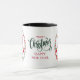 Em dois lados desta caneca Holiday, um pequeno gnomo engraçado veste um padrão de chapéu de Papai Noel com um toque de sagrado, e deixa um pássaro acender sua mão. Ao lado dele está o texto colorido que diz "JOY". Uma borda vermelha e verde da faixa de doces termina a design. No centro da caneca está estilizado texto em vermelho e verde que diz "Feliz Natal" e "Feliz ano novo".