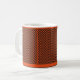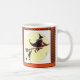 Caneca bonito do Dia das Bruxas com a bruxa no broomstick e no gato que penduram sobre para a cara vida. O design é ajustado contra um fundo checkered preto e alaranjado.