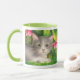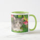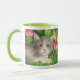 Um gatinho cinzento e branco minúsculo está escondendo entre algumas flores fúcsia. Trabalhos de arte por Carmen Medlin.