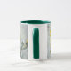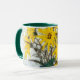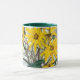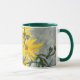 Ouro Girassóis em uma caneca branca com manípulo verde escuro e aro.