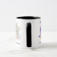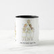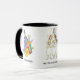 Uma caneca branca com jante preta e alça, decorada com três cenas de uma peça de Natal para crianças, de designs pintados em aquarelas por Judy Adamson. Os cartões de Natal com estas designs também estão disponíveis