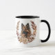 Uma bonito coroa de outono em tons de cinamão castanho, bronzeado e creme rodeia a imagem aquosa de um lindo Cão Tervuren belga. A imagem é impressa duas vezes na caneca, com seu texto personalizado entre eles.
