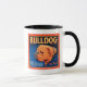 Um impressão de etiqueta de caixa de safra ilustrando um buldogue com um fundo azul padronizado e uma borda laranja. Escolha este impressão de arte no seu produto Zazzle hoje mesmo.