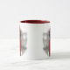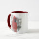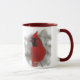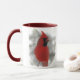 Imagens invertidas desta característica da caneca de um cardeal vermelho brilhante. É verdadeiramente o rei de pássaros do quintal! Está empoleirado aqui em um trilho nevado que come sementes de girassol pretas do óleo quando a neve do inverno rodar em torno dele.
